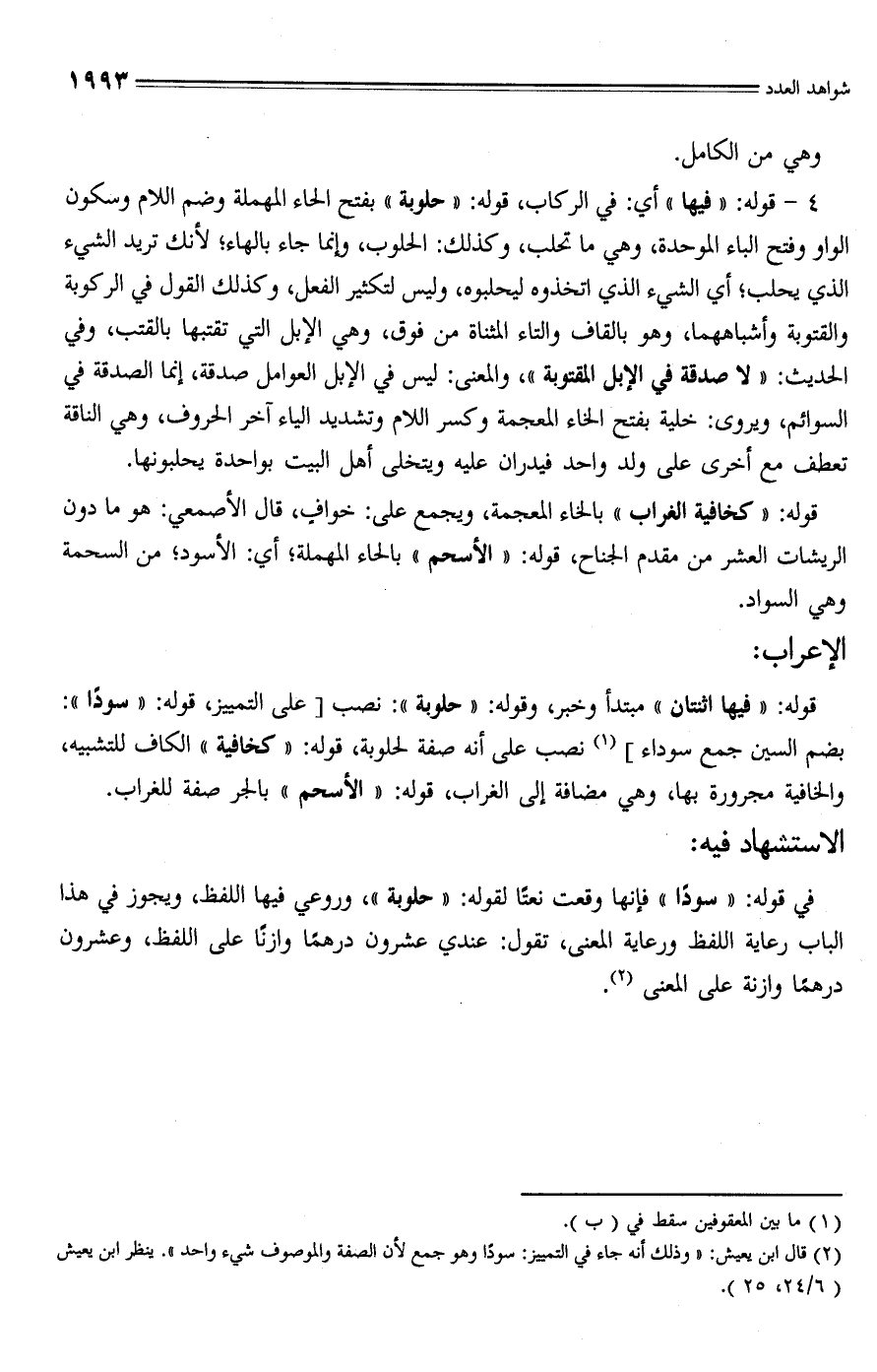 في قوله: "سودًا" فإنها وقعت نعتًا لقوله: "حلوبة"، وروعي فيها اللفظ، ويجوز في هذا الباب رعاية اللفظ ورعاية المعنى، تقول: عندي عشرون درهمًا وازنًا على اللفظ، وعشرون درهمًا وازنة على المعنى (¬2).