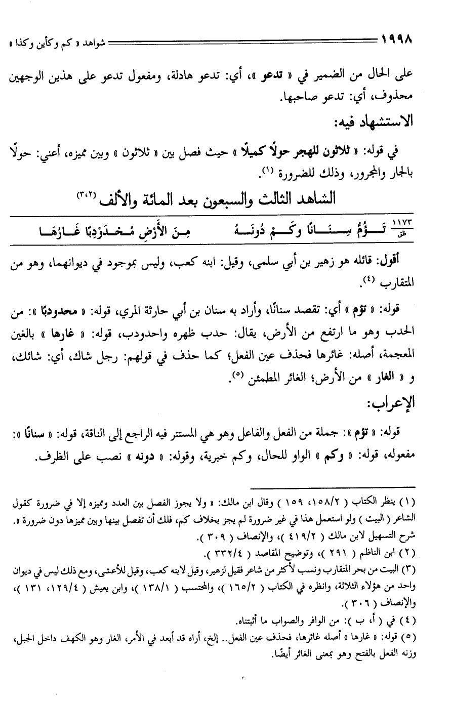(¬3) البيت من بحر المتقارب ونسب لأكثر من شاعر فقيل لزهير، وقيل لابنه كعب، وقيل للأعشى، ومع ذلك ليس في ديوان واحد من هؤلاء الثلاثة، وانظره في الكتاب (2/ 165)، والمحتسب (1/ 138)، وابن يعيش (4/ 129، 131)، والإنصاف (306).