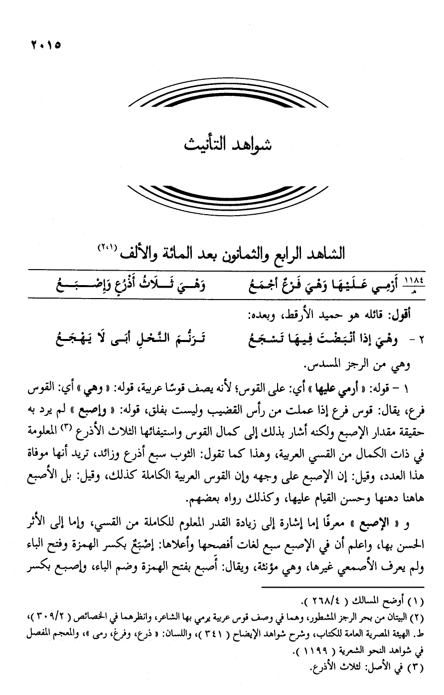(¬2) البيتان من بحر الرجز المشطور، وهما في وصف قوس عربية يرمي بها الشاعر، وانظرهما في الخصائص (2/ 309)، ط. الهيئة المصرية العامة للكتاب، وشرح شواهد الإيضاح (341)، واللسان: "ذرع، وفرغ، رمى"، والمعجم المفصل في شواهد النحو الشعرية (1199).