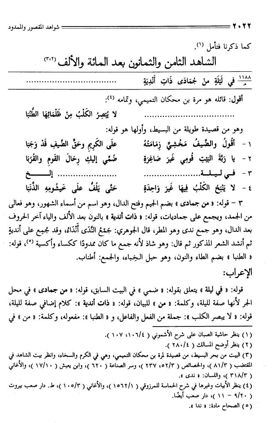 (¬3) البيت من بحر البسيط، من قصيدة لمرة بن محكان التميمي، وهي في الكرم والسخاء، وانظر بيت الشاهد في المقتضب (3/ 81)، والخصائص (3/ 52، 237)، وسر الصناعة (620)، وابن يعيش (1/ 170)، والأغاني (3/ 318)، واللسان: "ندى".