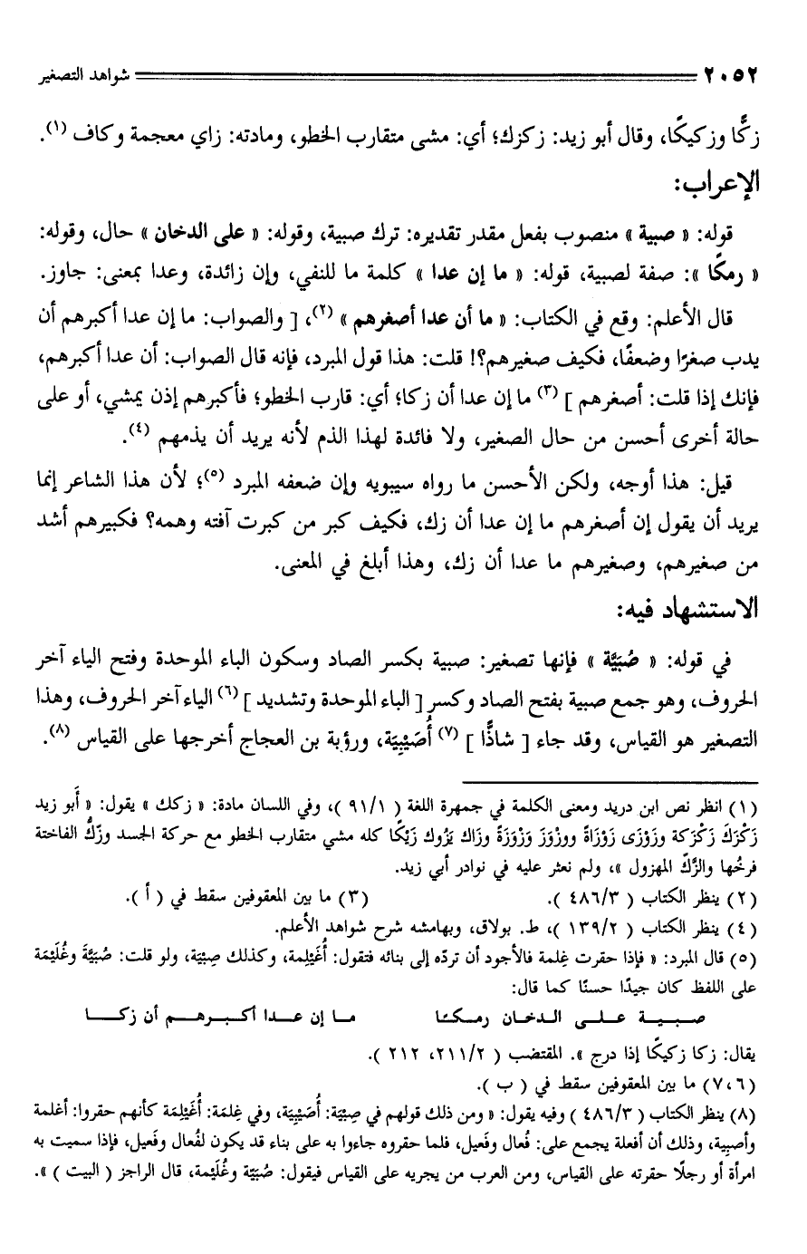 قال الأعلم: وقع في الكتاب: "ما أن عدا أصغرهم" (¬2)، [والصواب: ما إن عدا أكبرهم أن يدب صغرًا وضعفًا، فكيف صغيرهم؟! قلت: هذا قول المبرد، فإنه قال الصواب: أن عدا أكبرهم، فإنك إذا قلت: أصغرهم] (¬3) ما إن عدا أن زكا؛ أي: قارب الخطو؛ فأكبرهم إذن يمشي، أو على حالة أخرى أحسن من حال الصغير، ولا فائدة لهذا الذم لأنه يريد أن يذمهم (¬4).