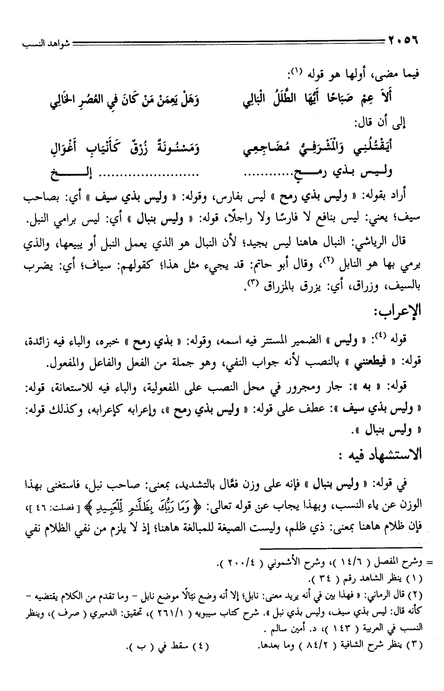 (¬2) قال الرماني: "فهذا بين في أنه يريد معنى: نابل؛ إلا أنه وضع نبّالًا موضع نابل -وما تقدم من الكلام يقتضيه- كأنه قال: ليس بذي سيف، وليس بذي نبل". شرح كتاب سيبويه (1/ 261)، تحقيق: الدميري (صرف)، وينظر النسب في العربية (143)، د. أمين سالم.