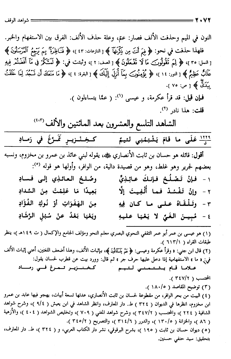 (¬2) قال ابن جني: "وقرأ عكرمة وعيسى: {عَمَّ يَتَسَاءَلُونَ}، بإثبات الألف، وهذا أضعف اللغتين، أعني إثبات الألف، في: "ما" الاستفهامية إذا دخل عليها حرف جر" ثم قال: وورد بيت عن قطرب لحسان يقول: