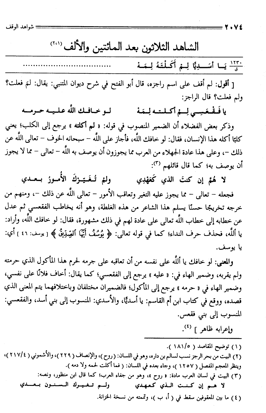 والمعنى: لو خافك يا أللَّه على نفسه من أن تعاقبه على جرمه لحرم هذا المأكول الذي حرمته ولم يقربه، وضمير الهاء في: "عليه" يرجع إلى الفقعسي؛ كما يقال: أخاف فلانًا على نفسي، وضمير الهاء في "حرمه" يرجع إلى المأكول؛ فالضميران مختلفان وباختلافهما يتم المعنى الذي قصده، ووقع في كتاب ابن أم القاسم: يا أسديًّا، والأسدي: المنسوب إلى بني أسد، والفقعسي: المنسوب إلى بني فقعس.