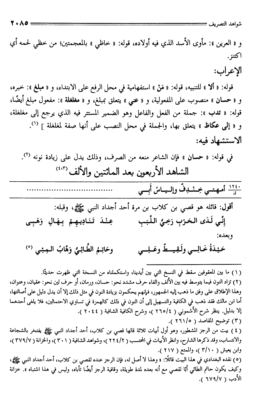 (¬5) نقده البغدادي في هذا البيت قائلًا: "وهذا لا أصل له، فإن الرجز عنده لقصي بن كلاب، أحد أجداد النبي - صلى الله عليه وسلم-، وكيف يكون حاتم الطائي أبًا لقصي مع أنه بعده لمدة طويلة، وقافية الرجز أيضًا تأباه، وليس في هذا اشتباه". خزانة الأدب (7/ 679).