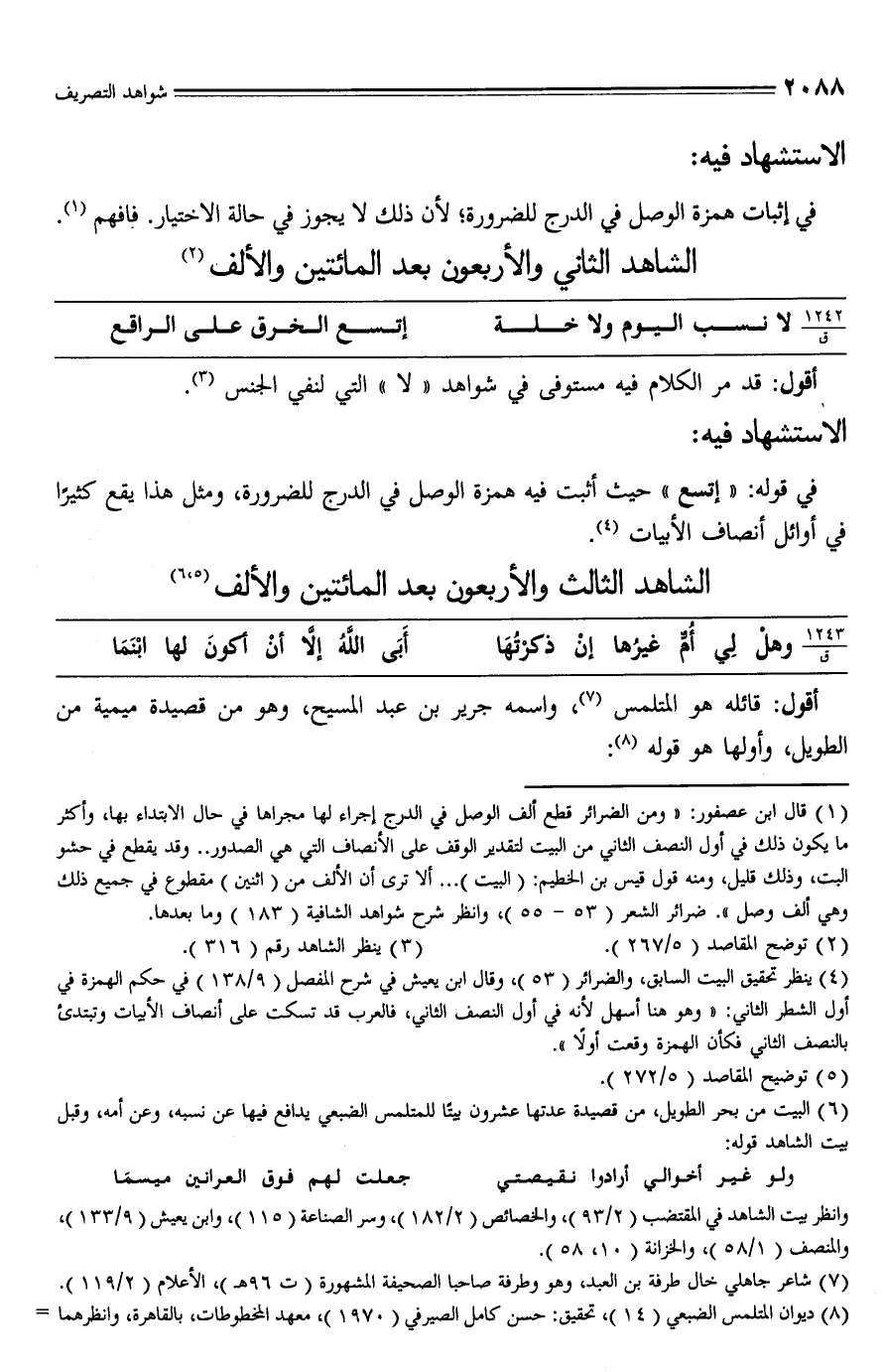 (¬1) قال ابن عصفور: "ومن الضرائر قطع ألف الوصل في الدرج إجراء لها مجراها في حال الابتداء بها، وأكثر ما يكون ذلك في أول النصف الثاني من البيت لتقدير الوقف على الأنصاف التي هي الصدور .. وقد يقطع في حشو البت، وذلك قليل، ومنه قول قيس بن الخطيم: (البيت) ... ألا ترى أن الألف من (اثنين) مقطوع في جميع ذلك وهي ألف وصل". ضرائر الشعر (53 - 55)، وانظر شرح شواهد الشافية (183) وما بعدها.