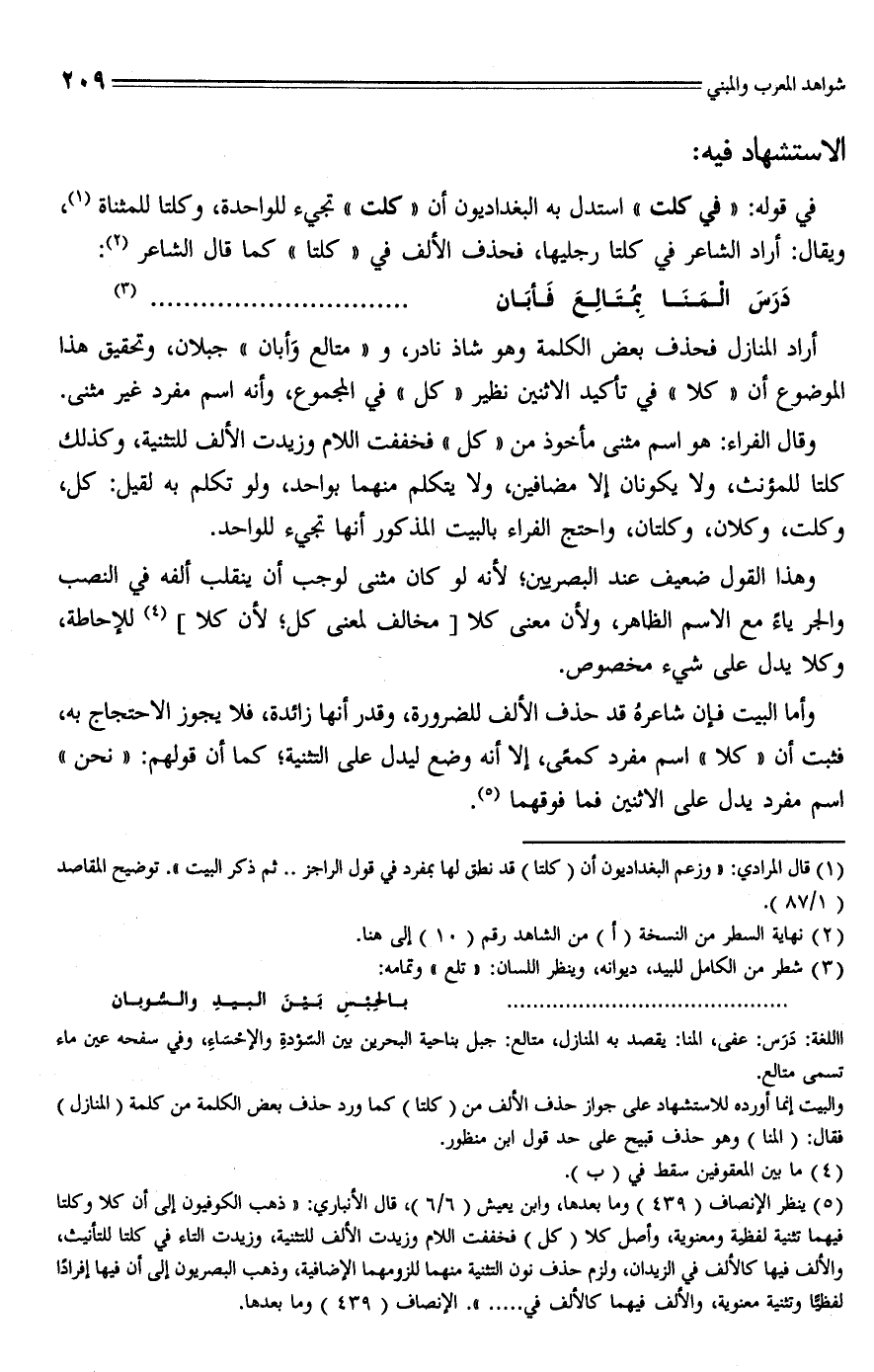 (¬5) ينظر الإنصاف (439) وما بعدها، وابن يعيش (6/ 6)، قال الأنباري: (ذهب الكوفيون إلى أن كلا وكلتا فيهما تثنية لفظية ومعنوية، وأصل كلا (كل) فخففت اللام وزيدت الألف للتثنية، وزيدت التاء في كلتا للتأنيث، والألف فيها كالألف في الزيدان، ولزم حذف نون المكانية منهما للزومهما الإضافية، وذهب البصريون إلى أن فيها إفرادًا لفظيًّا وتثنية معنوية، والألف فيهما كالألف في ..... ". الإنصاف (439) وما بعدها.