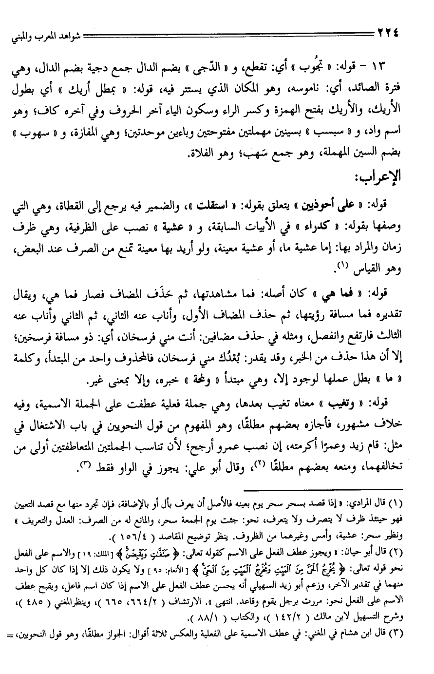 13 - قوله: "تجُوب" أي: تقطع، و "الدّجى" بضم الدال جمع دجية بضم الدال، وهي فترة الصائد؛ أي: ناموسه، وهو المكان الذي يستتر فيه، قوله: "بمطل أريك" أي بطول الأريك، والأريك بفتح الهمزة وكسر الراء وسكون الياء آخر الحروف وفي آخره كاف؛ وهو اسم واد، و "سبسب" بسينين مهملتين مفتوحتين وباءين موحدتين؛ وهي المفازة، و "سهوب" بضم السِّين المهملة، وهو جمع سَهب؛ وهو الفلاة.