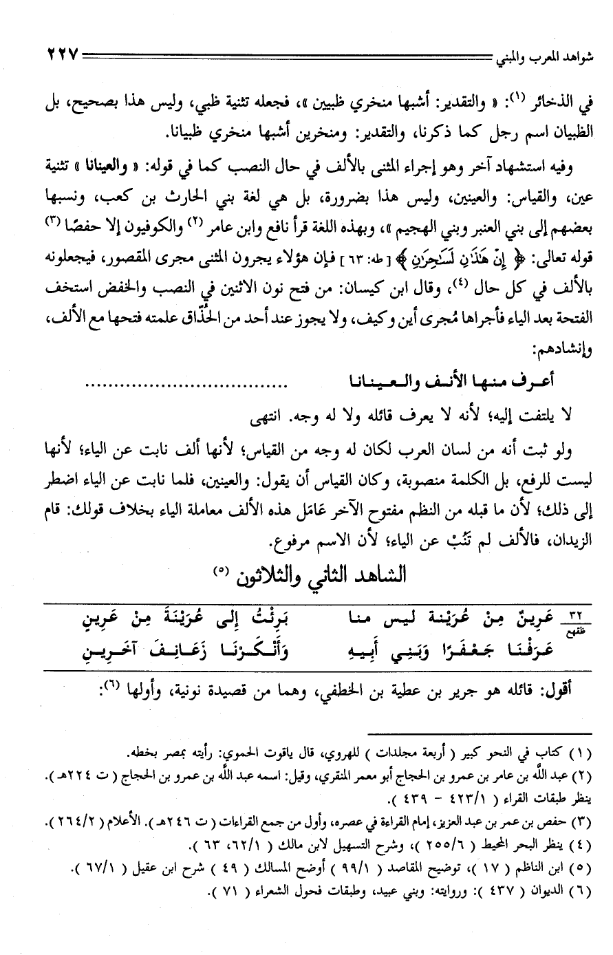 ولو ثبت أنَّه من لسان العرب لكان له وجه من القياس؛ لأنها ألف ثابت عن الياء؛ لأنها ليست للرفع، بل الكلمة منصوبة، وكان القياس أن يقول: والعينين، فلما ثابت عن الياء اضطر إلى ذلك؛ لأنَّ ما قبله من النظم مفتوح الآخر عَامَل هذه الألف معاملة الياء بخلاف قولك: قام الزيدان، فالألف لم تنُبْ عن الياء؛ لأنَّ الاسم مرفوع.