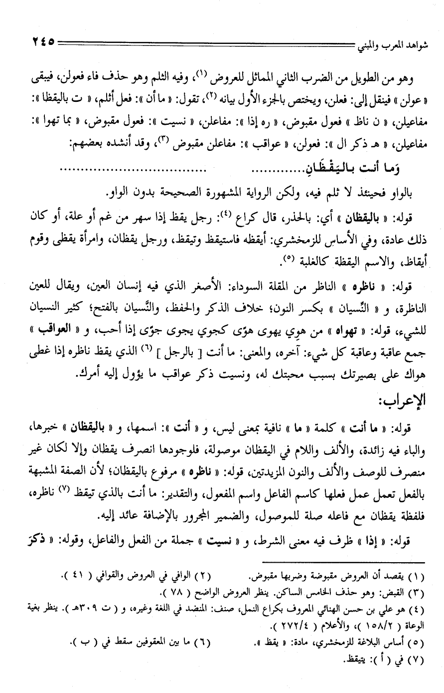 وهو من الطَّويل من الضرب الثَّاني المماثل للعروض (¬1)، وفيه الثلم وهو حذف فاء فعولن، فيبقى "عولن" فينقل إلى: فعلن، ويختص بالجزء الأول بيانه (¬2)، تقول: "ما أن": فعل أثلم، "ت باليقظا": مفاعيلن، "ن ناظ" فعول مقبوض، "ره إذا": مفاعلن، "نسيت": فعول مقبوض، "بما تهوا": مفاعيلن، " هـ ذكر ال": فعولن، "عواقب": مفاعلن مقبوض (¬3)، وقد أنشده بعضهم:
