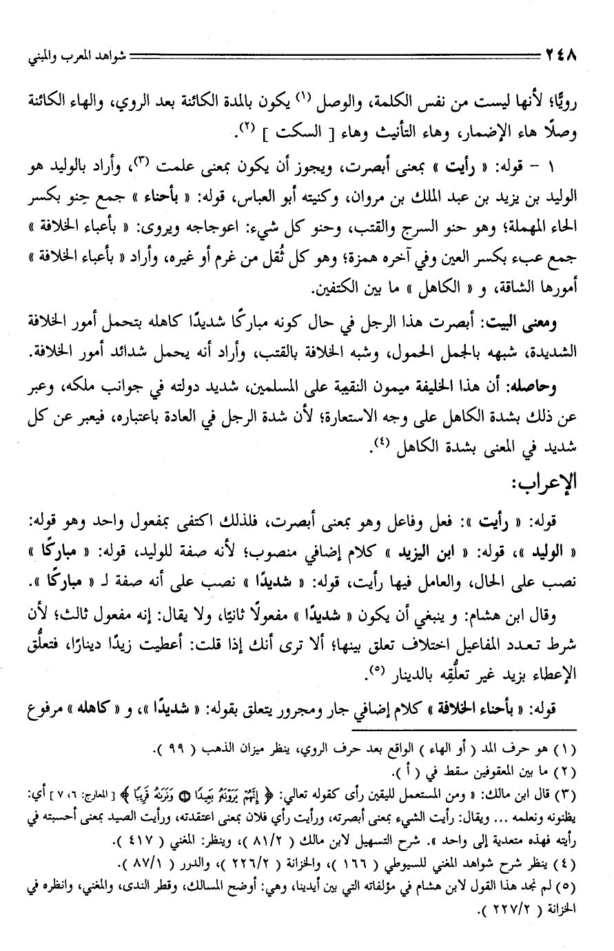 1 - قوله: "رأيت" بمعنى أبصرت، ويجوز أن يكون بمعنى علمت (¬3)، وأراد بالوليد هو الوليد بن يزيد بن عبد الملك بن مروان، وكنيته أبو العباس، قوله: "بأحناء" جمع حِنو بكسر الحاء المهملة؛ وهو حنو السرج والقتب، وحنو كل شيء: اعوجاجه ويروى: "بأعباء الخلافة" جمع عبء بكسر العين وفي آخره همزة؛ وهو كل ثُقل من غرم أو غيره، وأراد "بأعباء الخلافة" أمورها الشاقة، و "الكاهل" ما بين الكتفين.