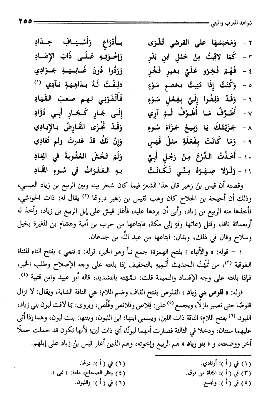 وقصته أن قيس بنَ زهير قال هذا الشعرَ فيما كان شجر بينه وبين الربيع بن زياد العبسي، وذلك أن أحيحة بن الجلاح كان وهب لقيس بن زهير دروعًا (¬2) يقال له: ذات الحواشي، فأخذها منه الربيع بن زياد، وأبي أن يردها عليه، فأغار قيسٌ على إبل الربيع بن زياد، وأخذ له أربعمائة ناقة، وقتل رُعاتها وفرّ إلى مكة، فابتاعها من حرب بن أمية وهشام بن المغيرة بخيل وسلاح وقال في ذلك، ويقال: ابتاعها من عبد الله بن جدعان.