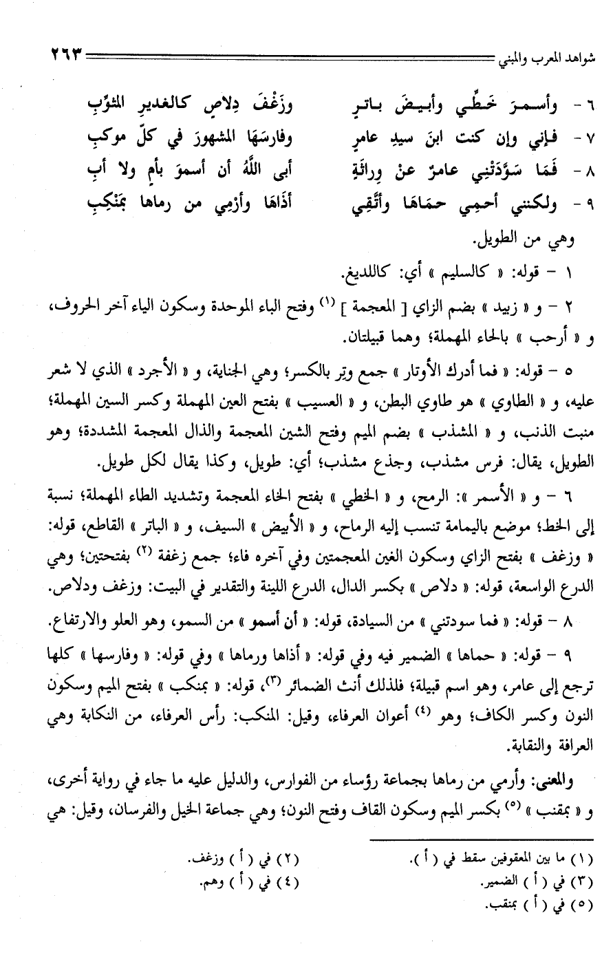 9 - قوله: "حماها" الضمير فيه وفي قوله: "أذاها ورماها" وفي قوله: "وفارسها" كلها ترجع إلى عامر، وهو اسم قبيلة؛ فلذلك أنث الضمائر (¬3)، قوله: "بمنكب" بفتح الميم وسكون النون وكسر الكاف؛ وهو (¬4) أعوان العرفاء، وقيل: المنكب: رأس العرفاء، من النكابة وهي العرافة والنقابة.