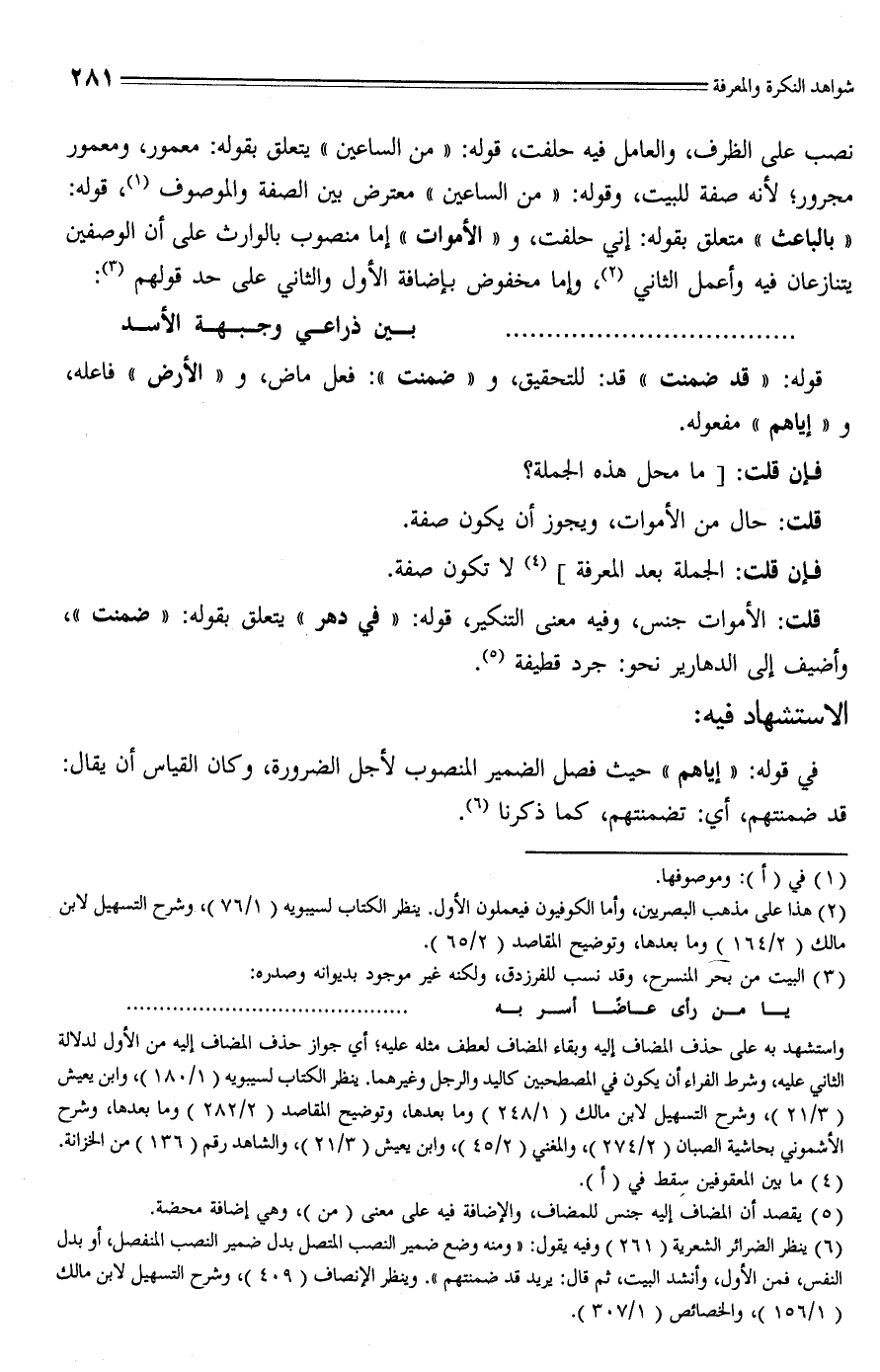 (¬6) ينظر الضرائر الشعرية (261) وفيه يقول: "ومنه وضع ضمير النصب المتصل بدل ضمير النصب المنفصل، أو بدل النفس، فمن الأول، وأنشد البيت، ثم قال: يريد قد ضمنتهم". وينظر الإنصاف (409)، وشرح التسهيل لابن مالك (1/ 156)، والخصائص (1/ 307).