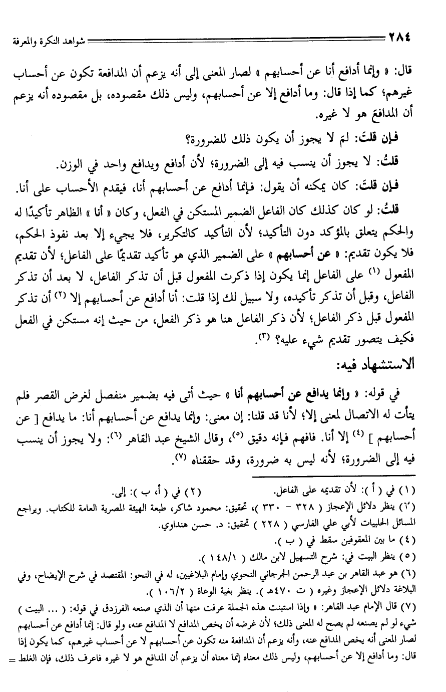 (¬6) هو عبد القاهر بن عبد الرحمن الجرجاني النحوي وإمام البلاغيين، له في النحو: المقتصد في شرح الإيضاح، وفي البلاغة دلائل الإعجاز وغيره (ت 470 هـ). ينظر بغية الوعاة (2/ 106).