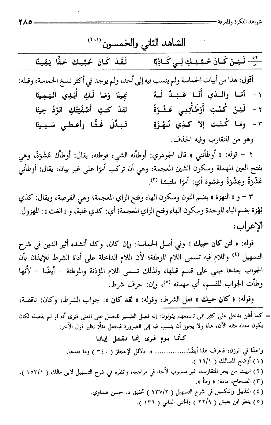 قوله: "لئن كان حبيك" وفي أصل الحماسة: وإن كان، وكذا أنشده أثير الدين في شرح التسهيل (¬4) واللام فيه تسمى اللام الموطئة؛ لأن اللام الداخلة على أداة الشرط للإيذان بأن الجواب بعدها مبني على قسم قبلها، ولذلك تسمى اللام المؤذنة والموطئة -أيضًا- لأنها وطأت الجواب للقسم، أي مهدته (¬5)، وإن: حرف شرط.