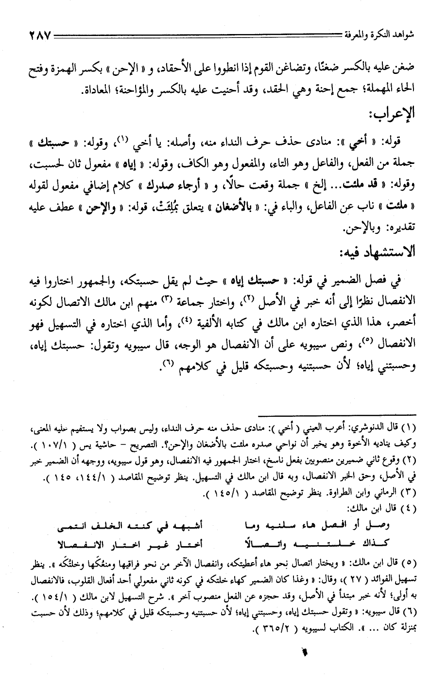 في فصل الضمير في قوله: "حسبتك إياه" حيث لم يقل حسبتكه، والجمهور اختاروا فيه الانفصال نظرًا إلى أنه خبر في الأصل (¬2)، واختار جماعة (¬3) منهم ابن مالك الاتصال لكونه أخصر، هذا الذي اختاره ابن مالك في كتابه الألفية (¬4)، وأما الذي اختاره في التسهيل فهو الانفصال (¬5)، ونص سيبويه على أن الانفصال هو الوجه، قال سيبويه وتقول: حسبتك إياه، وحسبتني إياه؛ لأن حسبتنيه وحسبتكه قليل في كلامهم (¬6).