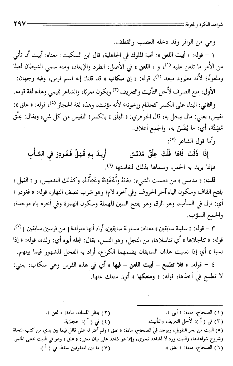(¬5) البيت من بحر الطويل، ويوجد في الصحاح، مادة: "علق" ولم أعثر له على قائل فيما بين يدي من كتب النحاة وشروح شواهدها، والبيت ورد لا لشاهد نحوي، وإنما هو شاهد على بيان معنى: "علق" وهو في البيت بمعنى الخمر.