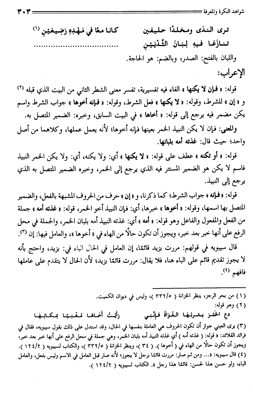 (¬3) هي العيني جواز أن تكون الحروف هي العاملة بنفسها في الحال، وقد استدل على ذلك بقول سيبويه، فقال في فرائد القلائد: "قوله: (غذته أمه) أي غذته النبيذ أمه بلبان الخمر، وهي جملة في محل الرفع على أنها خبر بعد خبر، ويجوز أن تكون حالًا من الهاء في (أخوها). (34)، وينظر الخزانة (5/ 332)، والكتاب لسيبويه (2/ 124).