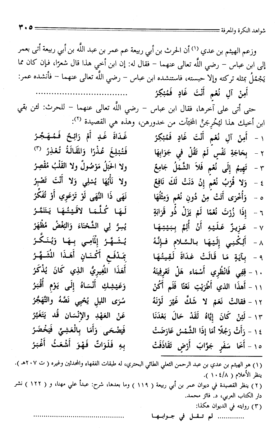 (¬2) ينظر القصيدة في ديوان عمر بن أبي ربيعة (119) وما بعدها، شرح: عبدأ علي مهنا، و (122) نشر دار الكتاب العربي، د. فائز محمد.