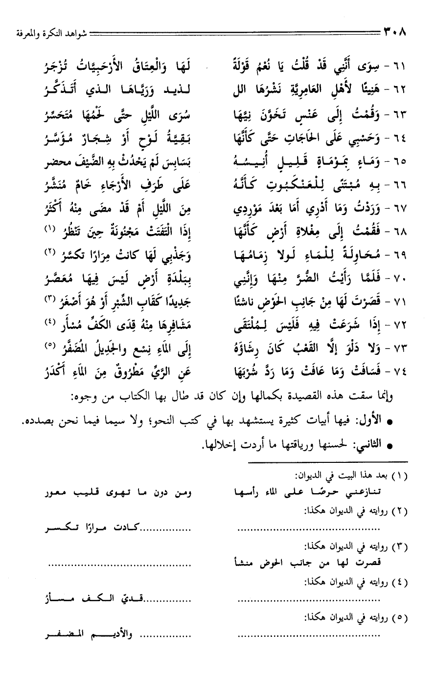 • الأول: فيها أبيات كثيرة يستشهد بها في كتب النحو؛ ولا سيما فيما نحن بصدده.