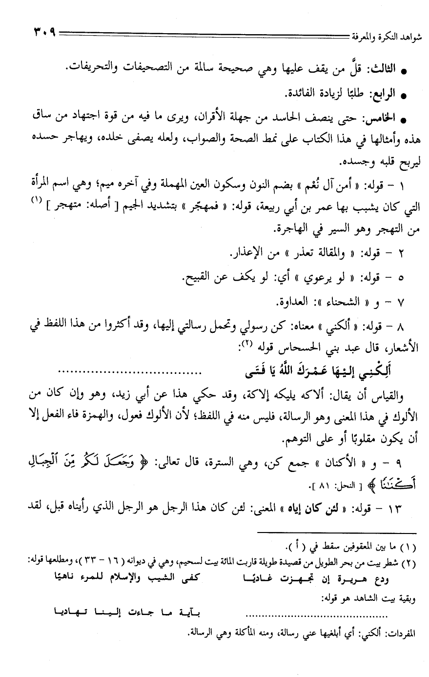 • الخامس: حتى ينصف الحاسد من جهلة الأقران، ويرى ما فيه من قوة اجتهاد من ساق هذه وأمثالها في هذا الكتاب على نمط الصحة والصواب، ولعله يصفى خلده، ويهاجر حسده ليربح قلبه وجسده.