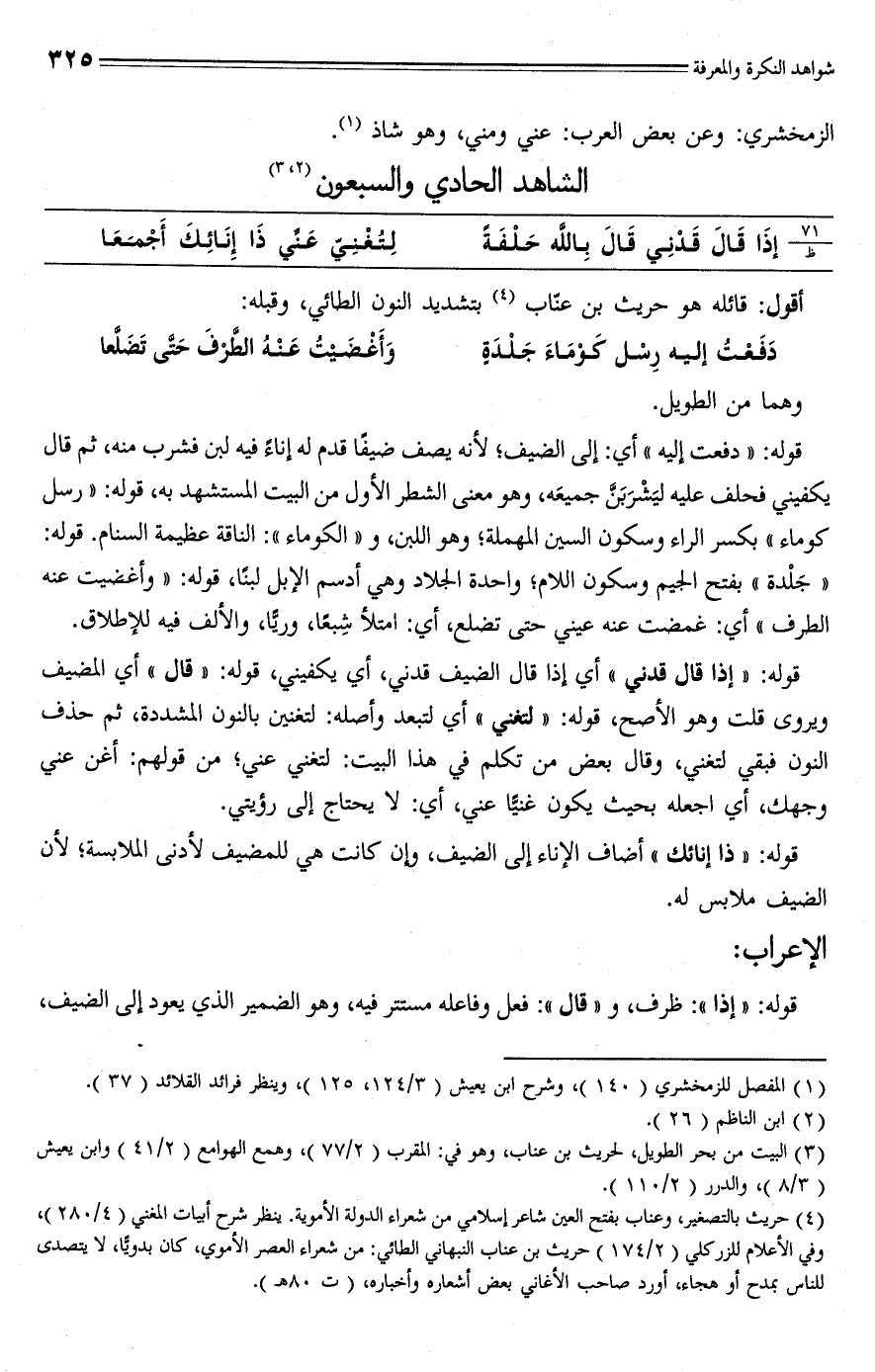 (¬4) حريث بالتصغير، وعناب بفتح العين شاعر إسلامي من شعراء الدولة الأموية. ينظر شرح أبيات المغني (4/ 280)، وفي الأعلام للزركلي (2/ 174) حريث بن عناب النبهاني الطائي: من شعراء العصر الأموي، كان بدويًّا، لا يتصدى للناس بمدح أو هجاء، أورد صاحب الأغاني بعض أشعاره وأخباره، (ت 80 هـ).