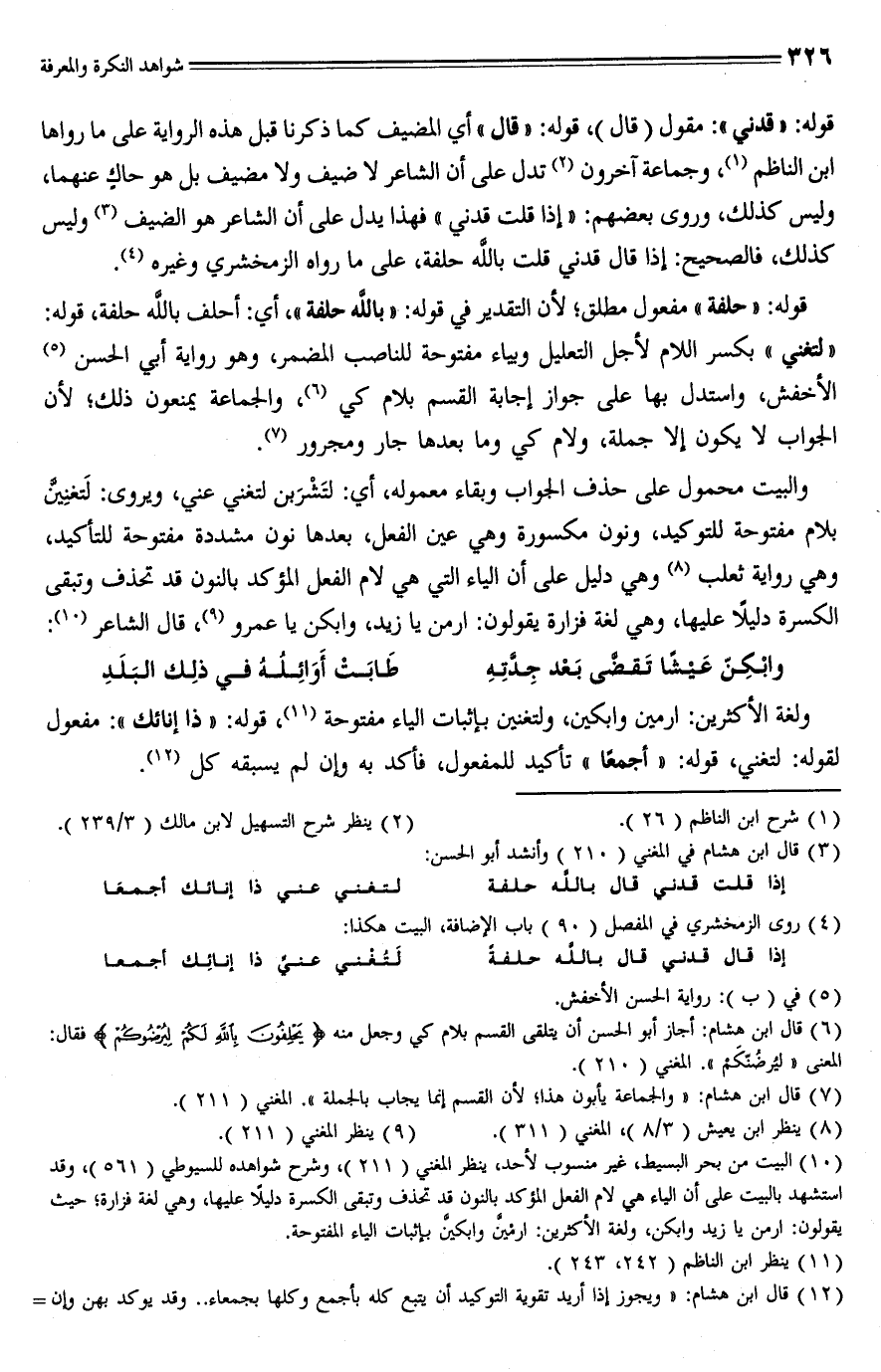 ولغة الأكثرين: ارمين وابكين، ولتغنين بإثبات الياء مفتوحة (¬11)، قوله: "ذا إنائك": مفعول لقوله: لتغني، قوله: "أجمعًا" تأكيد للمفعول، فأكد به وإن لم يسبقه كل (¬12).