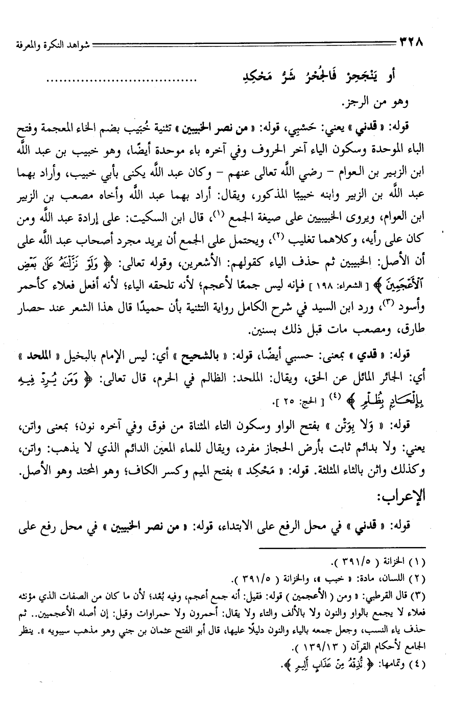 قوله: "قدني" يعني: حَسْبِي، قوله: "من نصر الخبيبين" تثنية خُبَيب بضم الخاء المعجمة وفتح الباء الموحدة وسكون الياء آخر الحروف وفي آخره باء موحدة أيضًا، وهو خبيب بن عبد اللَّه بن الزبير بن العوام - رضي اللَّه تعالى عنهم - وكان عبد اللَّه يكنى بأبي خبيب، وأراد بهما عبد اللَّه بن الزبير وأبنه خبيبًا المذكور، ويقال: أراد بهما عبد اللَّه وأخاه مصعب بن الزبير بن العوام، ويروى الخبيبيين على صيغة الجمع (¬1)، قال ابن السكيت: على إرادة عبد اللَّه ومن كان على رأيه، وكلاهما تغليب (¬2)، ويحتمل على الجمع أن يريد مجرد أصحاب عبد اللَّه على أن الأصل: الخبيبين ثم حذف الياء كقولهم: الأشعرين، وقوله تعالى: {وَلَوْ نَزَّلْنَاهُ عَلَى بَعْضِ الْأَعْجَمِينَ} [الشعراء: 198]، فإنه ليس جمعًا لأعجم؛ لأنه تلحقه الياء؛ لأنه أفعل فعلاء كأحمر وأسود (¬3)، ورد ابن السيد في شرح الكامل رواية التثنية بأن حميدًا قال هذا الشعر عند حصار طارق، ومصعب مات قبل ذلك بسنين.