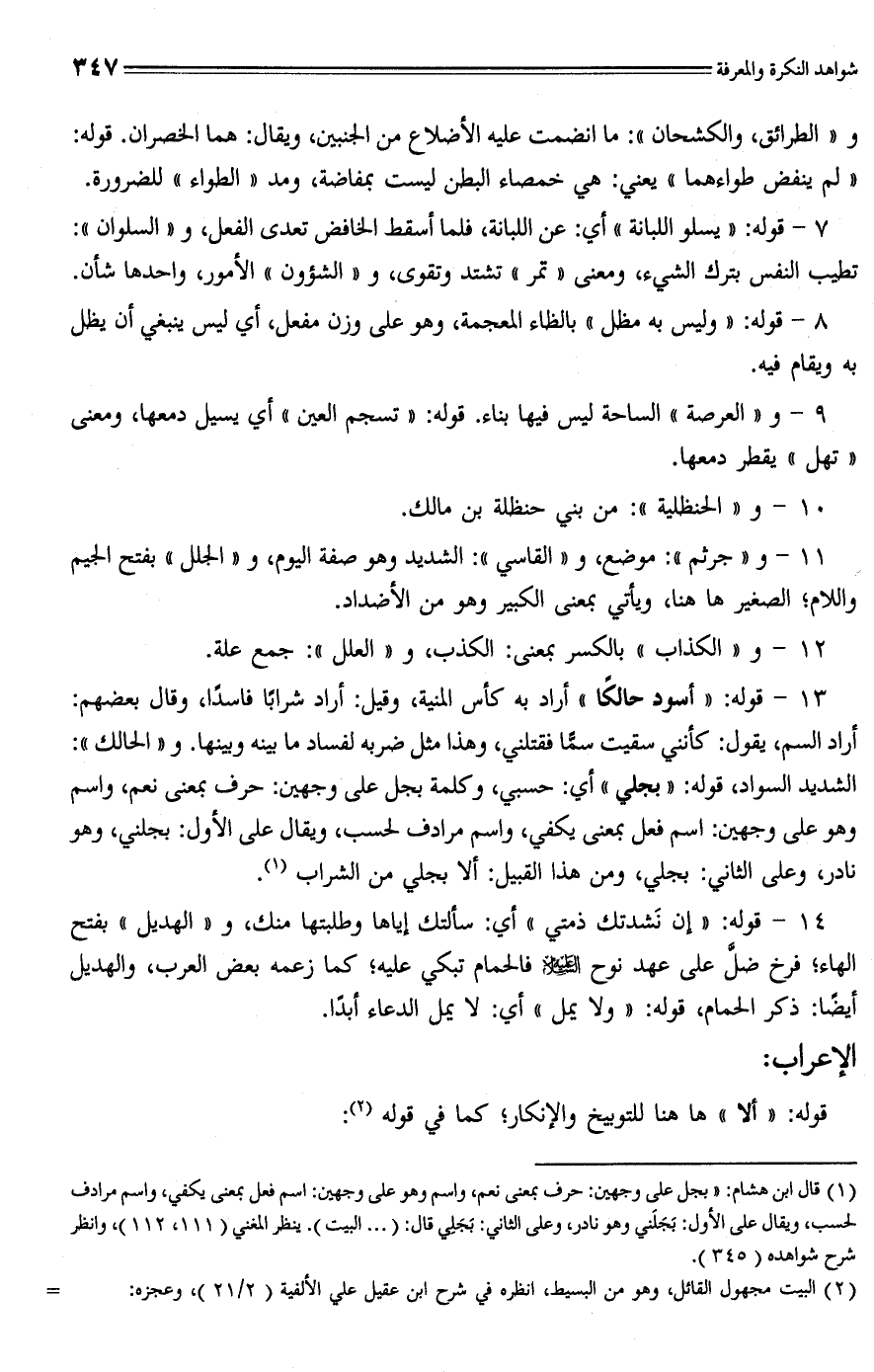 13 - قوله: "أسود حالكًا" أراد به كأس المنية، وقيل: أراد شرابًا فاسدًا، وقال بعضهم: أراد السم، يقول: كأنني سقيت سمَّا فقتلني، وهذا مثل ضربه لفساد ما بينه وبينها. و "الحالك": الشديد السواد، قوله: "بجلي" أي: حسبي، وكلمة بجل على وجهين: حرف بمعنى نعم، واسم وهو على وجهين: اسم فعل بمعنى يكفي، واسم مرادف لحسب، ويقال على الأول: بجلني، وهو نادر، وعلى الثاني: بجلي، ومن هذا القبيل: ألا بجلي من الشراب (¬1).