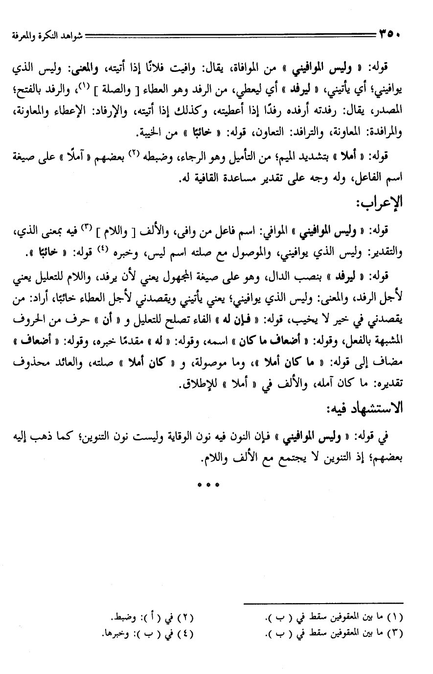 قوله: "وليس الموافيني" الموافي: اسم فاعل من وافى، والألف [واللام] (¬3) فيه بمعنى الذي، والتقدير: وليس الذي يوافيني، والموصول مع صلته اسم ليس، وخبره (¬4) قوله: "خائبًا".