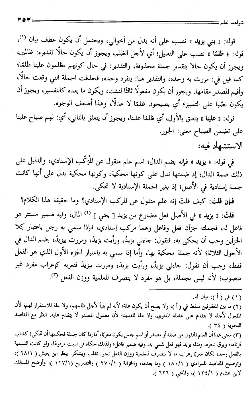 (¬3) معنى هذا أن العلم المنقول من صفة أو مصدر أو اسم جنس يكون معربًا، أما إذا كان جملة فحكمها أن تحكى؛ كشاب قرناها، وبرق نحره، ومثله نريد فهو فعل سُمي به، وفيه ضمير فاعل؛ ولذلك حكاه في البيت مرفوعًا، ولو كانت التسمية بالفعل وحده لكان معربًا إعراب ما لا ينصرف للعلمية ووزن الفعل نحو: تغلب ويشكر. ينظر ابن يعيش (1/ 28)، وتوضيح المقاصد للمرادي (1/ 180) وما بعدها، والخزانة (1/ 270) والتصريح (1/ 117)، وأوضح المسالك لابن هشام (1/ 124)، والمغني (626).