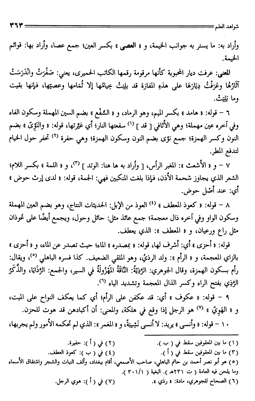 6 - قوله: "هامد" بكسر الميم، وهو الرماد، و "السُّفْع" بضم السين المهملة وسكون الفاء وفي آخره عين مهملة؛ وهي الأثافي [قد] (¬1) سفعتها النار؛ أي غيرتها، قوله: "والنَؤِيّ" بضم النون وكسر الهمزة؛ جمع نؤى بضم النون وسكون الهمزة؛ وهي حفرة (¬2) تحفر حول الخيام لتدفع المطر.