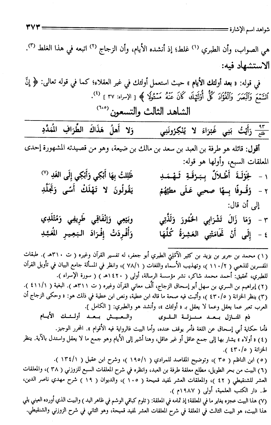 (¬6) البيت من بحر الطويل، مطلع معلقة طرفة بن العبد، وانظره في شرح المعلقات السبع للزوزني (38)، والمعلقات العشر للشنقيطي (42)، والمعلقات العشر لمفيد قميحة (105)، والديوان (19) شرح مهدي ناصر الدين، ط. دار الكتب العلمية، أولى (1987 م).