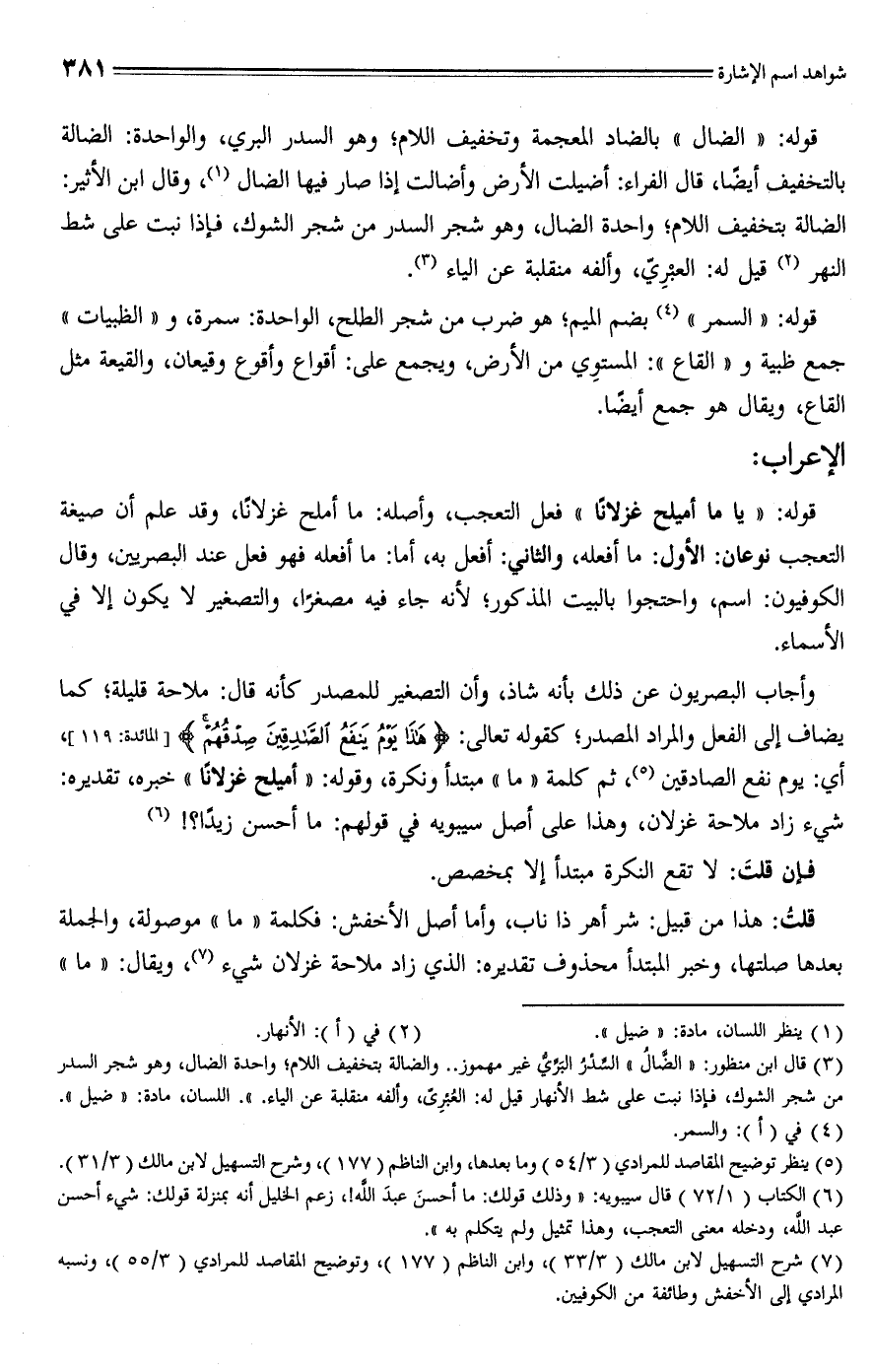 وأجاب البصريون عن ذلك بأنه شاذ، وأن التصغير للمصدر كأنه قال: ملاحة قليلة؛ كما يضاف إلى الفعل والمراد المصدر؛ كقوله تعالى: {هَذَا يَوْمُ يَنْفَعُ الصَّادِقِينَ صِدْقُهُمْ} [المائدة: 119]، أي: يوم نفع الصادقين (¬5)، ثم كلمة "ما" مبتدأ ونكرة، وقوله: "أميلح غزلانًا" خبره، تقديره: شيء زاد ملاحة غزلان، وهذا على أصل سيبويه في قولهم: ما أحسن زيدًا؟! (¬6)