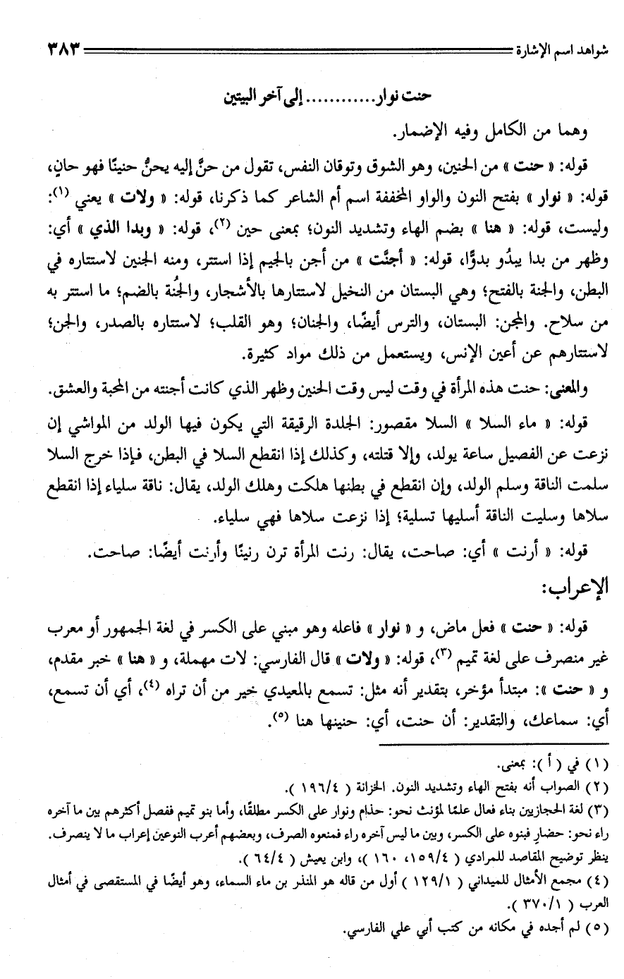 قوله: "حنت" فعل ماض، و"نوار" فاعله وهو مبني على الكسر في لغة الجمهور أو معرب غير منصرف على لغة تميم (¬3)، قوله: "ولات" قال الفارسي: لات مهملة، و"هنا" خبر مقدم، و"حنت": مبتدأ مؤخر، بتقدير أنه مثل: تسمع بالمعيدي خير من أن تراه (¬4)، أي أن تسمع، أي: سماعك، والتقدير: أن حنت، أي. حنينها هنا (¬5).