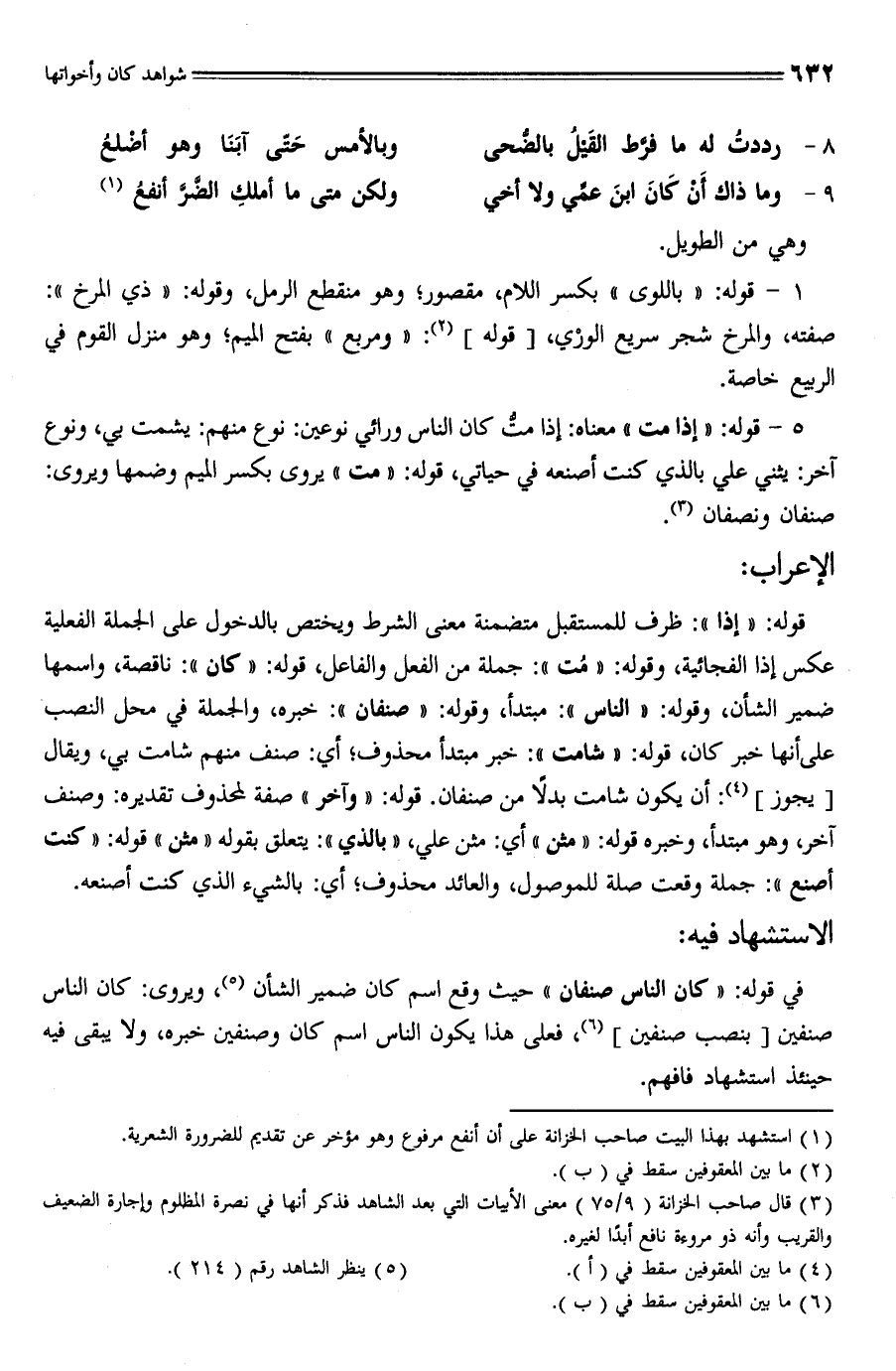 في قوله: "كان الناس صنفان" حيث وقع اسم كان ضمير الشأن (¬5)، ويروى: كان الناس صنفين [بنصب صنفين] (¬6)، فعلى هذا يكون الناس اسم كان وصنفين خبره، ولا يبقى فيه حينئذ استشهاد فافهم.