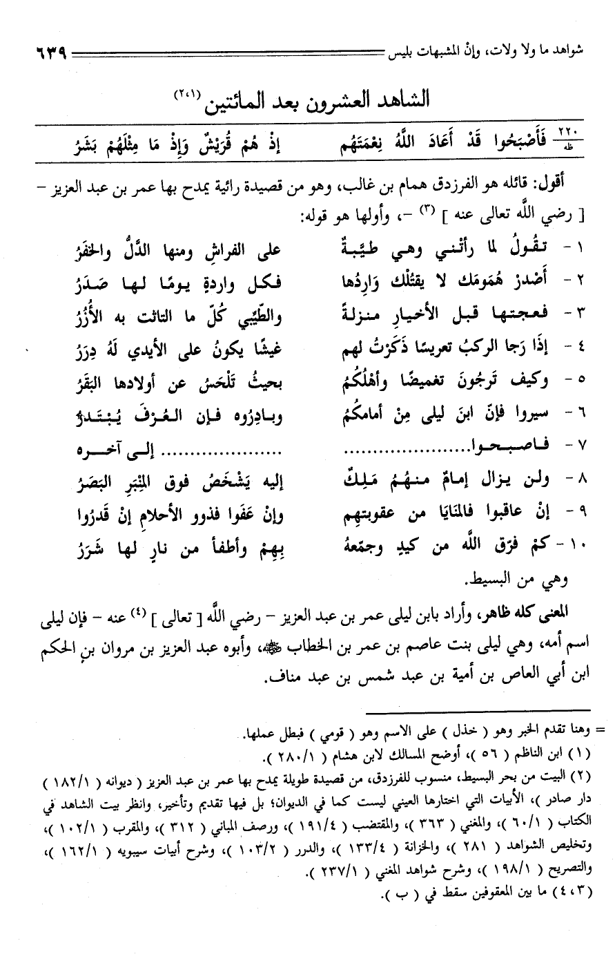 (¬2) البيت من بحر البسيط، منسوب للفرزدق، من قصيدة طويلة يمدح بها عمر بن عبد العزيز (ديوانه (1/ 182) دار صادر)، الأبيات التي اختارها العيني ليست كما في الديوان؛ بل فيها تقديم وتأخير، وانظر بيت الشاهد في الكتاب (1/ 60)، والمغني (363)، والمقتضب (4/ 191)، ورصف المباني (312)، والمقرب (1/ 102)، وتخليص الشواهد (281)، والخزانة (4/ 133)، والدرر (2/ 103)، وشرح أبيات سيبويه (1/ 162)، والتصريح (1/ 198)، وشرح شواهد المغني (1/ 237).