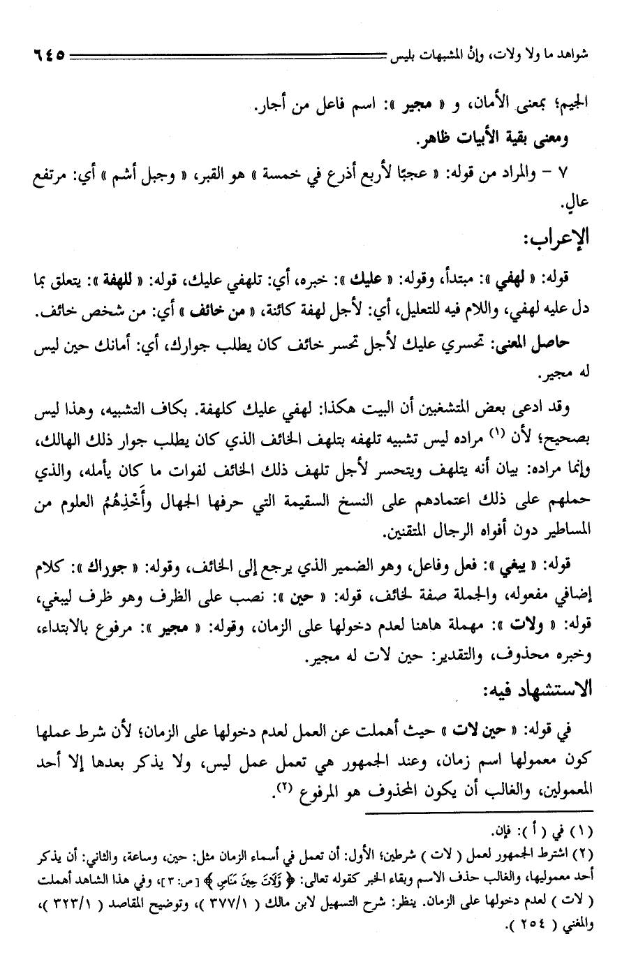 (¬2) اشترط الجمهور لعمل (لات) شرطين؛ الأول: أن تعمل في أسماء الزمان مثل: حين، وساعة، والثاني: أن يذكر أحد معموليها، والغالب حذف الاسم وبقاء الخبر كقوله تعالى: {وَّلَاتَ حِينَ مَنَاصٍ} [ص: 3]، وفي هذا الشاهد أهملت (لات) لعدم دخولها على الزمان. ينظر: شرح التسهيل لابن مالك (1/ 377)، وتوضيح المقاصد (1/ 323)، والمغني (254).