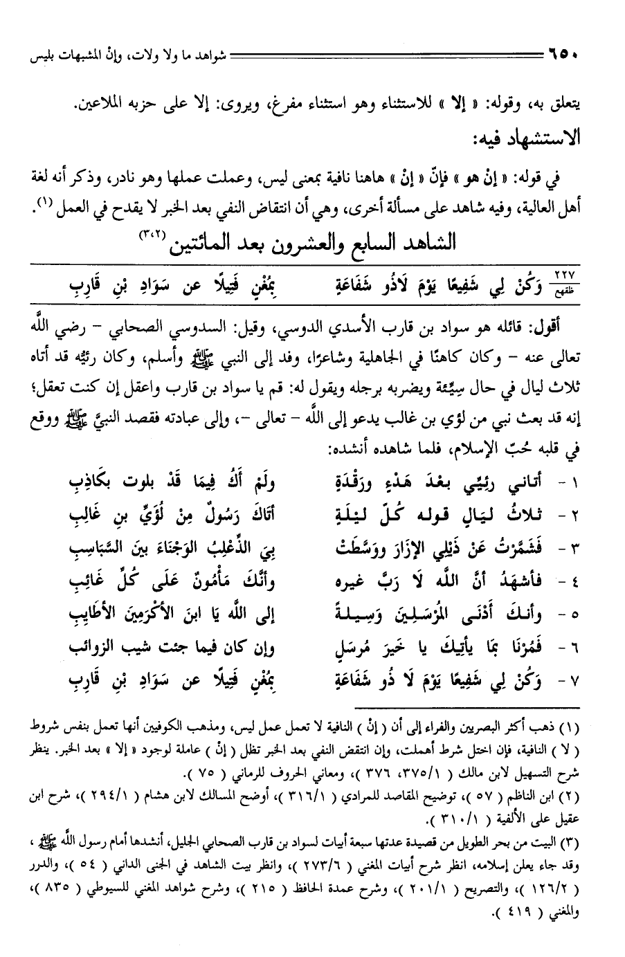 (¬3) البيت من بحر الطويل من قصيدة عدتها سبعة أبيات لسواد بن قارب الصحابي الجليل، أنشدها أمام رسول الله - صلى الله عليه وسلم -، وقد جاء يعلن إسلامه، انظر شرح أبيات المغني (6/ 273)، وانظر بيت الشاهد في الجنى الداني (54)، والدرر (2/ 126)، والتصريح (1/ 201)، وشرح عمدة الحافظ (215)، وشرح شواهد المغني للسيوطي (835)، والمغني (419).