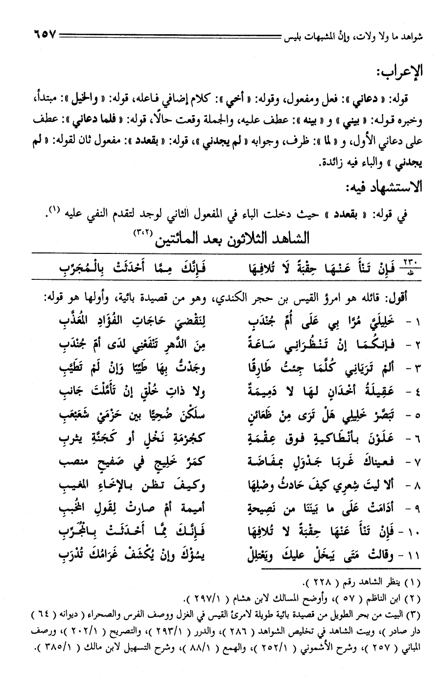 (¬3) البيت من بحر الطويل من قصيدة بائية طويلة لامرئ القيس في الغزل ووصف الفرس والصحراء (ديوانه (64) دار صادر)، وبيت الشاهد في تخليص الشواهد (286)، والدرر (1/ 293)، والتصريح (1/ 202)، ورصف المباني (257)، وشرح الأشموني (1/ 252)، والهمع (1/ 88)، وشرح التسهيل لابن مالك (1/ 385).