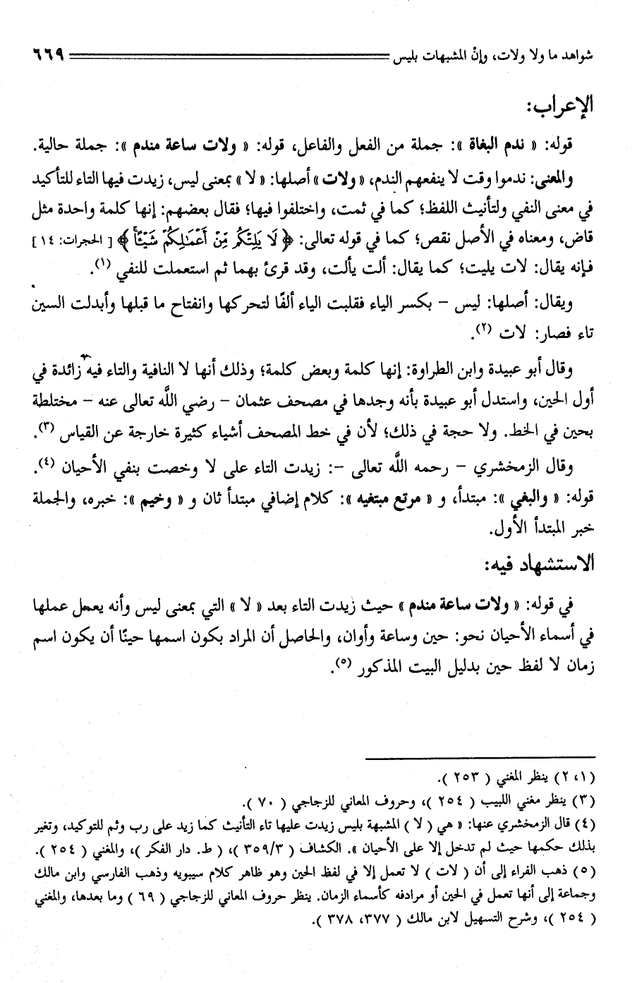 (¬4) قال الزمخشري عنها: "هي (لا) المشبهة بليس زيدت عليها تاء التأنيث كما زيد على رب وثم للتوكيد، وتغير بذلك حكمها حيث لم تدخل إلا على الأحيان". الكشاف (3/ 359)، (ط. دار الفكر)، والمغني (254).