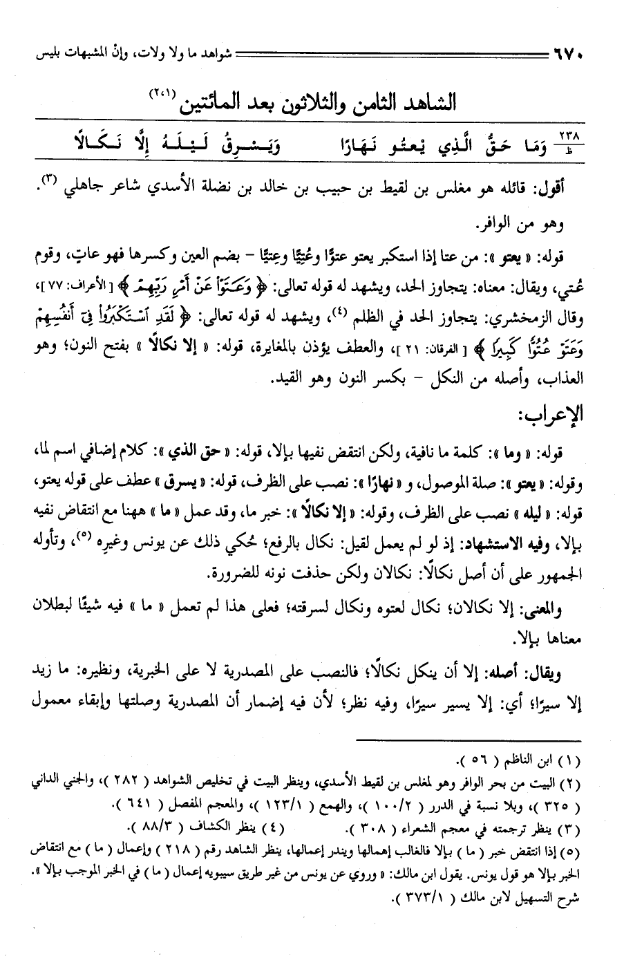 قوله: "وما": كلمة ما نافية، ولكن انتقض نفيها بإلا، قوله: "حق الذي": كلام إضافي اسم لما، وقوله: "يعتو": صلة الموصول، و"نهارًا": نصب على الظرف، قوله: "يسرق" عطف على قوله يعتو، قوله: "ليله" نصب على الظرف، وقوله: "إلا نكالًا"؛ خبر ما، وقد عمل "ما" ها هنا مع انتقاض نفيه بإلا، وفيه الاستشهاد: اذ لو لم يعمل لقيل: نكال بالرفع؛ حُكي ذلك عن يونس وغيره (¬5)، وتأوله الجمهور على أن أصل نكالًا: نكالان ولكن حذفت نونه للضرورة.