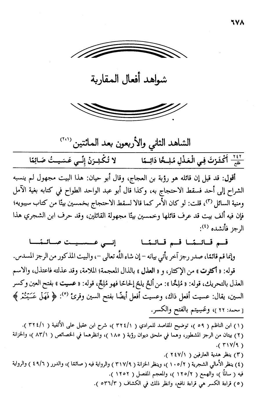 (¬4) ينظر الأمالي الشجرية (2/ 105)، وينظر الخزانة (9/ 317) والرواية فيه (صائمًا)، والدرر (6/ 49) والرواية فيه (سالمًا)، والهمع (2/ 125)، والمعجم المفصل (1252).