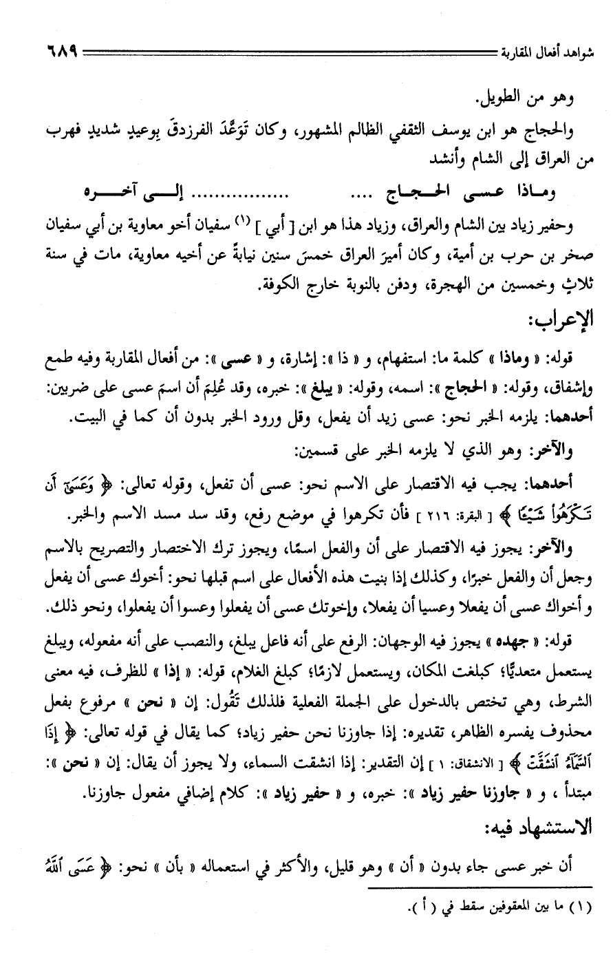 قوله: "وماذا" كلمة ما: استفهام، و"ذا": إشارة، و"عسى": من أفعال المقاربة وفيه طمع وإشفاق، وقوله: "الحجاج": اسمه، وقوله: "يبلغ": خبره، وقد عُلِمَ أن اسمَ عسى على ضربين: أحدهما: يلزمه الخبر نحو: عسى زيد أن يفعل، وقل ورود الخبر بدون أن كما في البيت.