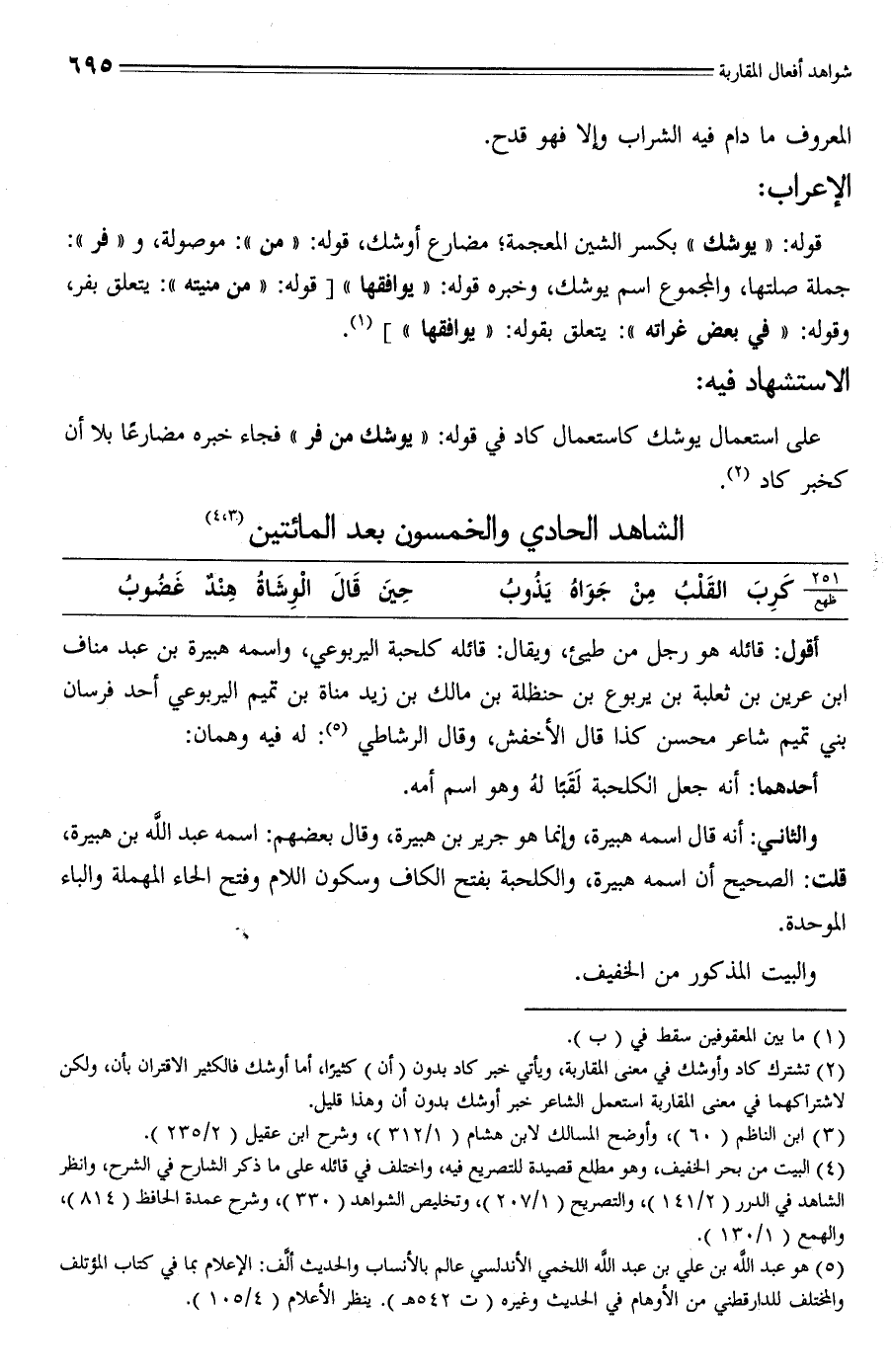 (¬2) تشترك كاد وأوشك في معنى المقاربة، ويأتي خبر كاد بدون (أن) كثيرًا، أم أوشك فالكثير الاقتران بأن، ولكن لاشتراكهما في معنى المقاربة استعمل الشاعر خبر أوشك بدون أن وهذا قليل.