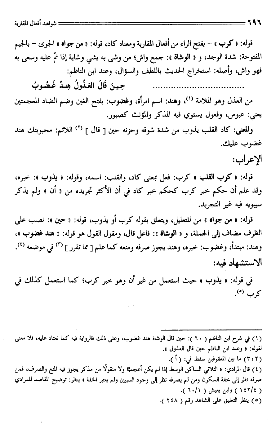 قوله: "من جواه" من للتعليل، ويتعلق بقوله كرب أو يذوب، قوله: "حين": نصب على الظرف مضاف إلى الجملة، و"الوشاة": فاعل قال، ومقول القول هو قوله: "هند غضوب"، وهند: مبتدأ، وغضوب: خبره، وهند يجوز صرفه ومنعه كما علم [مما تقرر] (¬3) في موضعه (¬4).