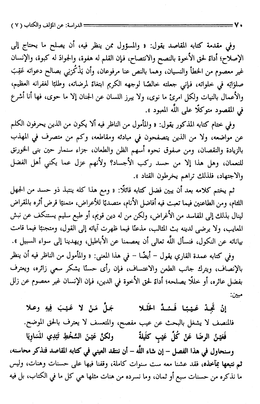 وفي مقدمة كتابه المقاصد يقول: "والمسؤول ممن ينظر فيه، أن يصلح ما يحتاج إلى الإصلاح؛ أداءً لحق الأخوة بالنصح والانتصاح، فإن القلم له هفوة، والجوادَ له كبوة، والإنسان غير معصوم من الخطأ والنسيان، وهما بالنص عنا مرفوعان، وأن يَذْكُرَني بصالح دعواته عَقِبَ صلوَاتِه في خلواته، فإني جعلته خالصًا لوجهه الكريم ابتغاء لمرضاته، وطلبًا لغفرانه العظيم، والأعمال بالنيات ولكل امرئ ما نوى، ولا يبرز اللسان عن الجنان إلَّا ما حوى، فها أنا أشرع في المقصود متوكلًا على الله المعبود".