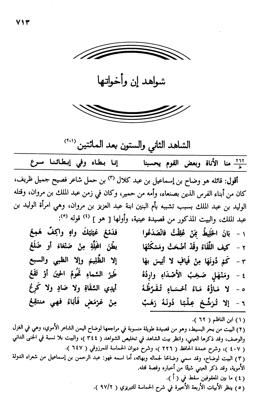 (¬3) البيت لوضاح، وقد سمي وضاحًا لجماله وبهائه، أما اسمه فهو: عبد الرَّحْمَن بن إسماعيل من شعراء الدولة الأموية، وقد ذكر العيني شيئًا من أخباره وقصة قتله.