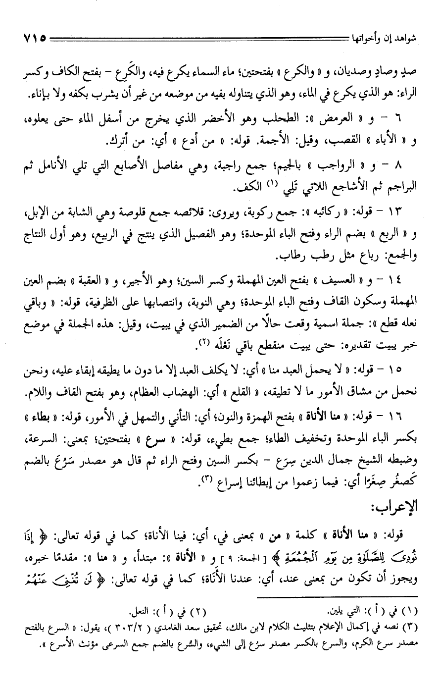 (¬3) نصه في إكمال الأعلام بتثليث الكلام لابن مالك، تحقيق سعد الغامدي (2/ 303)، يقول: "السرع بالفتح مصدر سرع الكرم، والسرع بالكسر مصدر سرُع إلى الشيء، والسُّرع بالضم جمع السرعى مؤنث الأسرع".